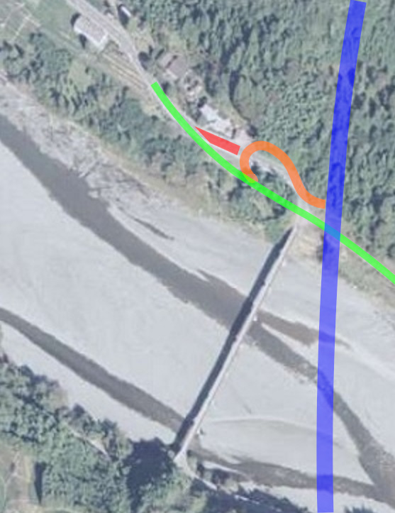 また、図中には(あくまで推測ですが)緑線で川根寸又峡線、青線で国道362号線、橙線で その取付道路を描き込んでみました。